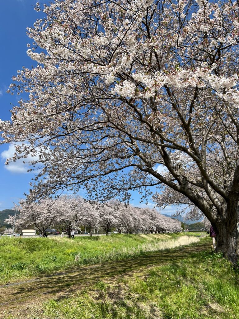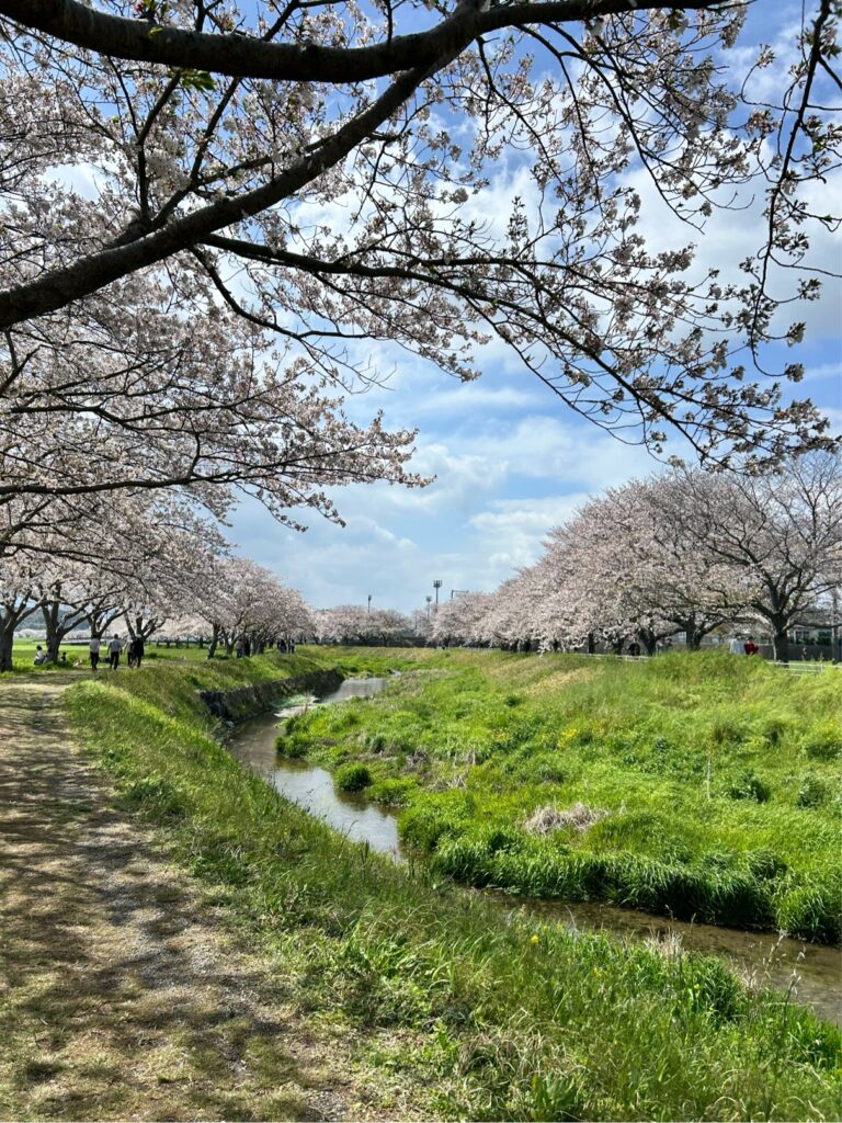 草場川沿いに続く桜並木は、のんびりお散歩しながら楽しめる穴場の名所。川沿いの遊歩道を子どもと歩けば、まるで絵本の中に入り込んだような気分になれます。キャンプついでにお花見ドライブも楽しめるロケーションです。