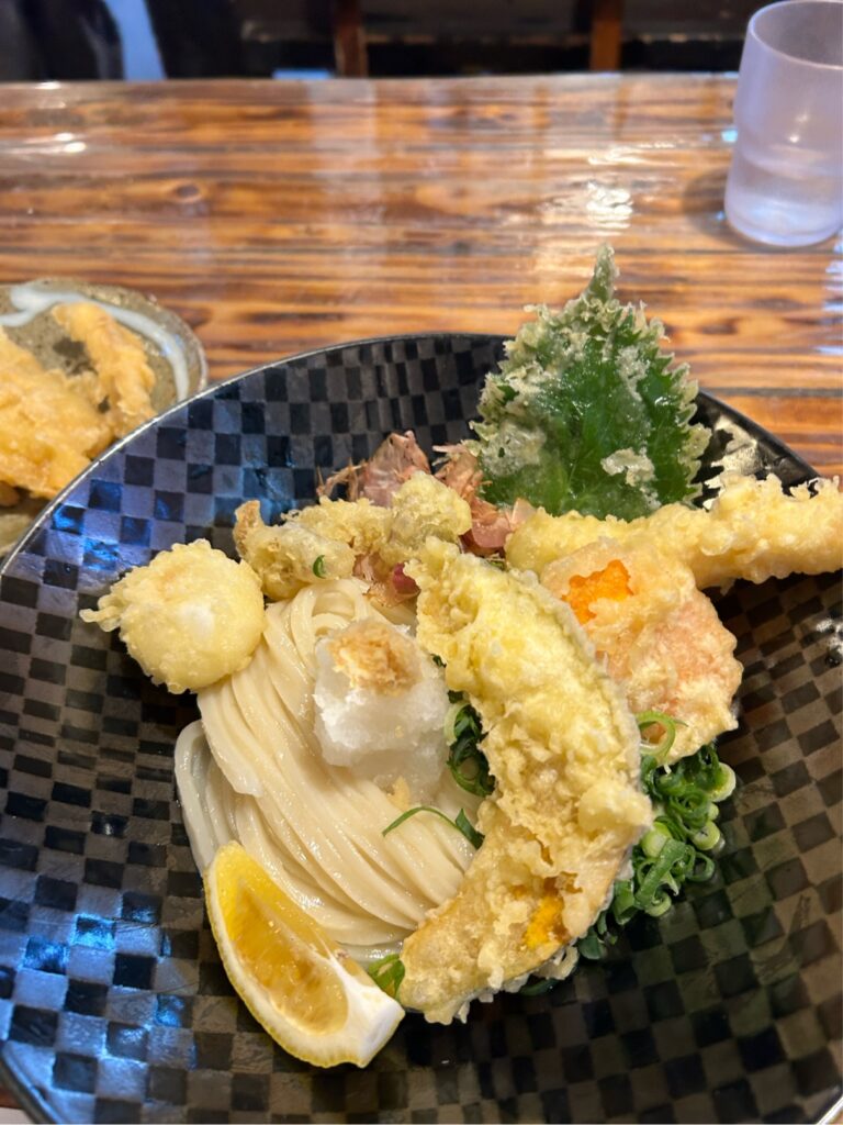 おからやお漬物が無料。天ぷらはサクサクで、大根おろしとレモンの酸味で爽やかなおつゆに、コシのあるモチモチのうどんが美味しかったです。