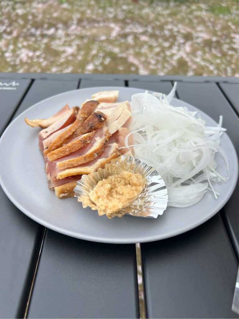 近くにある肉のたかお筑前町本店は、キャンプ前の食材調達にもぴったり。特に鶏のたたきが絶品でした!ハンバーグやウインナーなど子どもが喜ぶもメニューもここで購入可。お肉の他にも、焼き野菜やきのこ類など、BBQに必要そうなものも揃います。