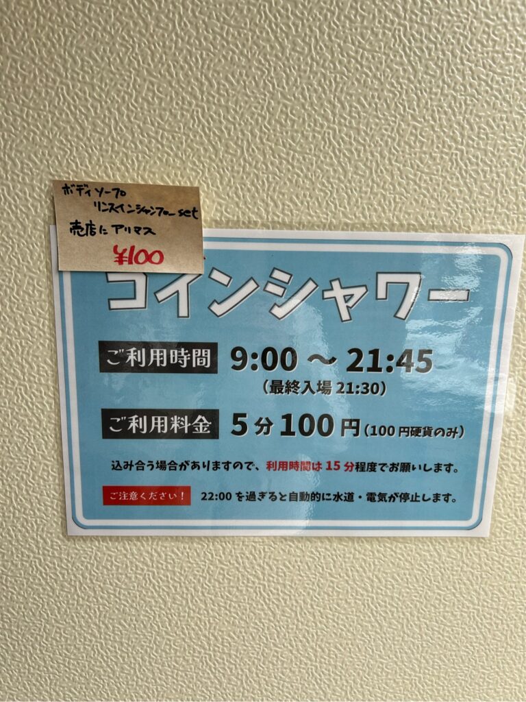 5分100円。暗証番号を押してロックを解除して入ります。キャンプ場利用者のみ使用できます。