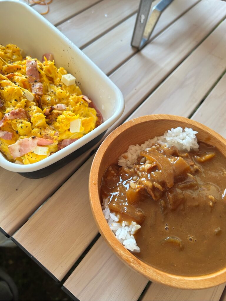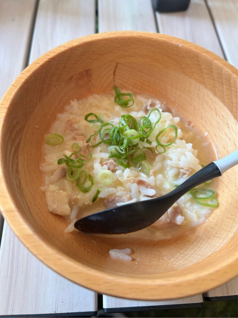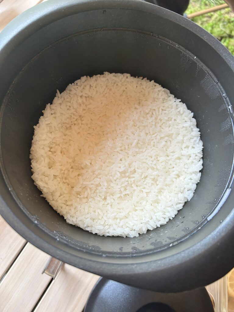 ご飯はキャンプの相棒。ティファールのライスポットで炊きました。
