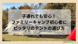 キャンプ場のチェックイン時間はだいたい正午前後。キャンプ場に着いたら、折りたたみのミニテーブルをレジャーシートにセット。厚めのレジャーシートの上にテーブルを開くだけで、1分もかからずセッティングは完了です。夫婦でテント設営をしている間に子どもに食事してもらう用に使っています。開くだけで簡単に使え、ランチョンマットくらいの広さで子ども1人分の食事には十分なサイズ。子どもはご飯を食べている間はうろうろせず黙って座っているので、夫婦でのテントの設営作業がはかどります。